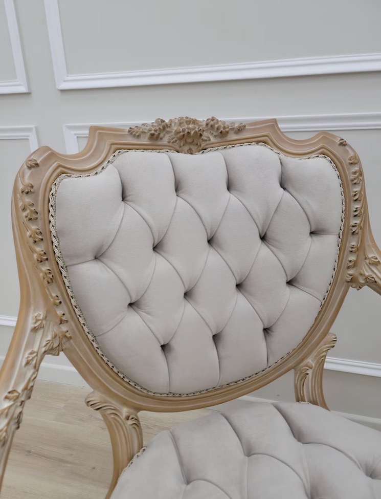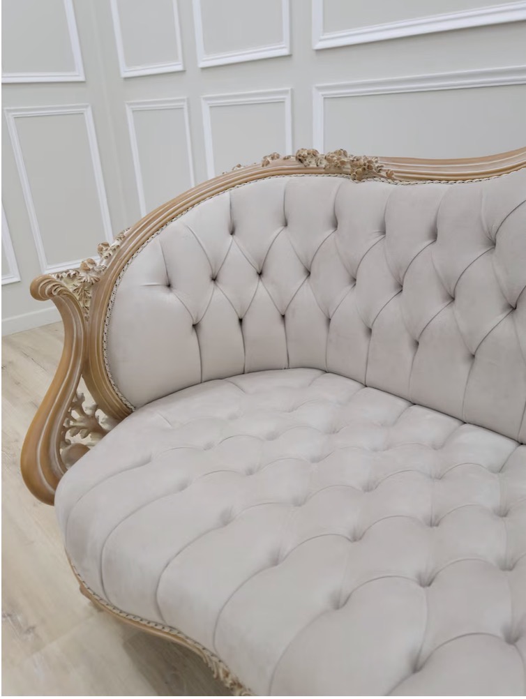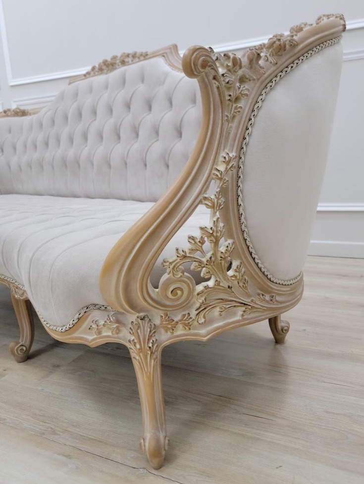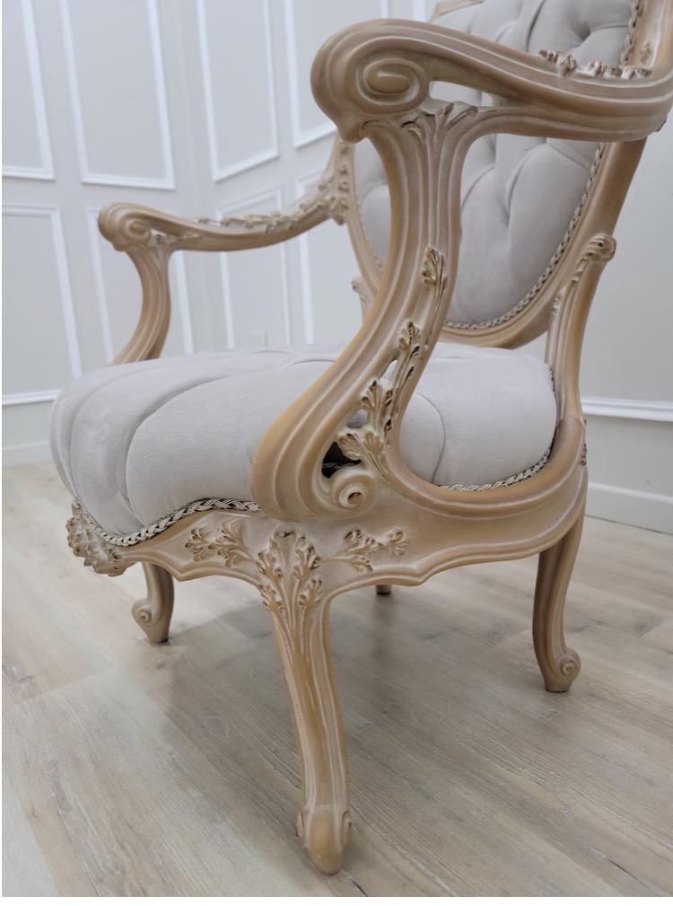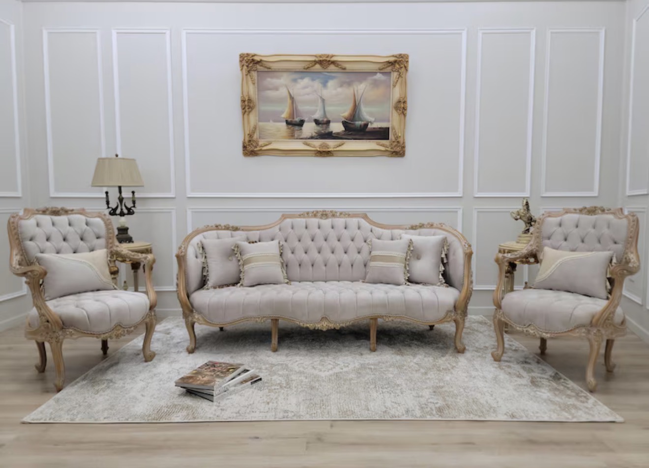 Transform your living space into a sophisticated oasis with this Elegant French-inspired Living Room Set. Crafted with a hand carved wood frame and luxurious light taupe velvet fabric, this set includes a stunning sofa, a pair of armchairs, and a cozy ottoman. Elevate your home decor with timeless elegance and comfort!