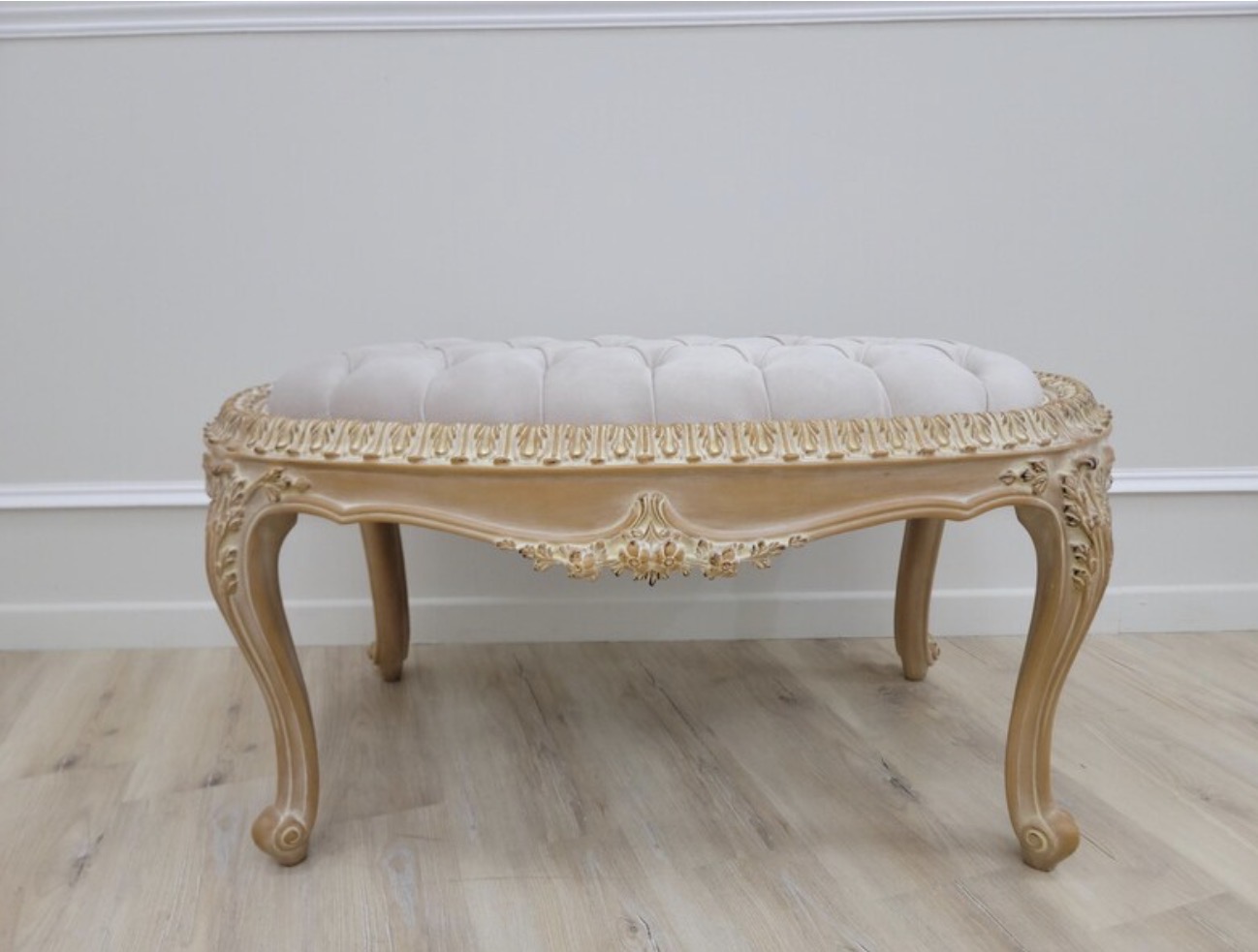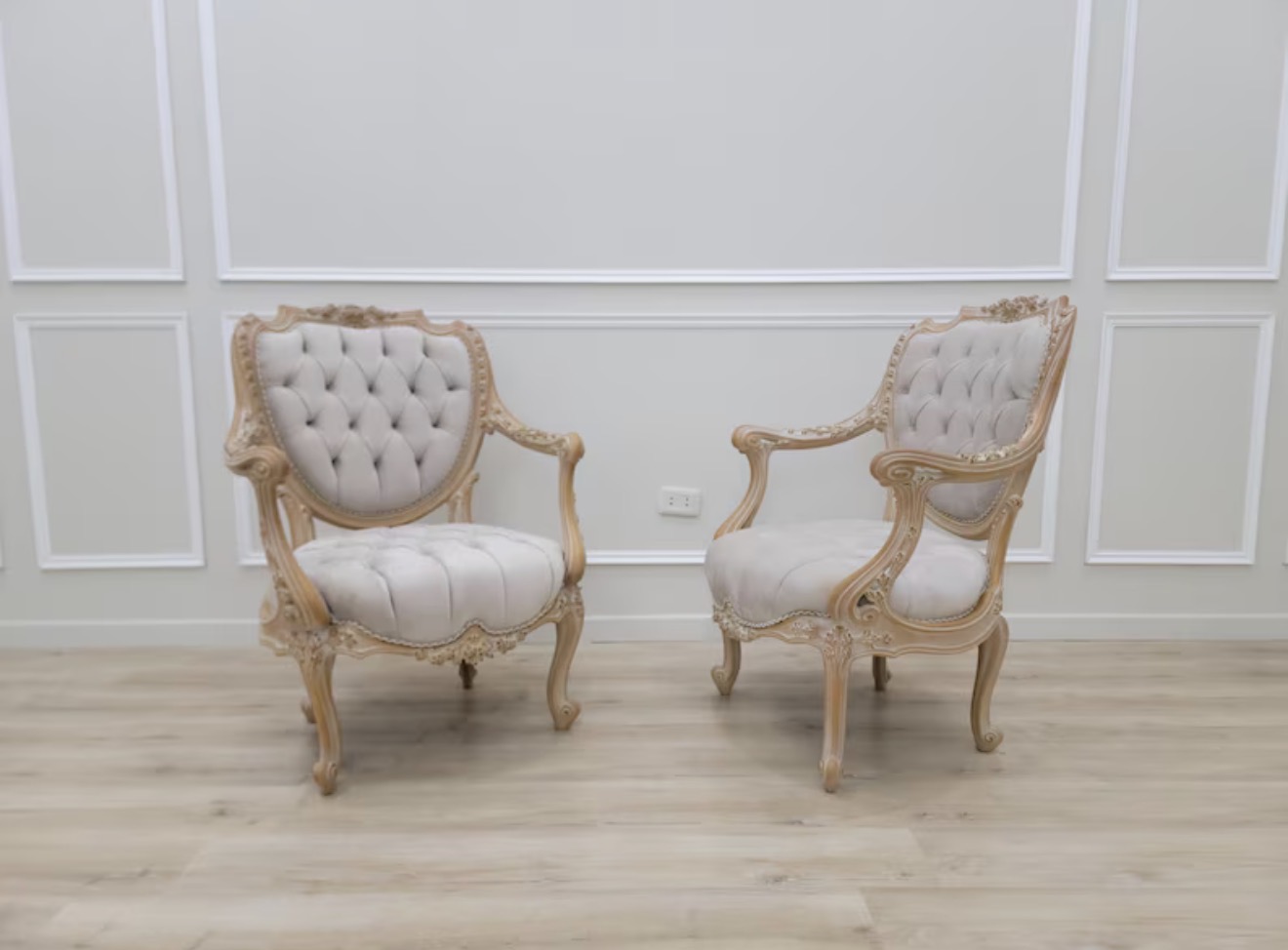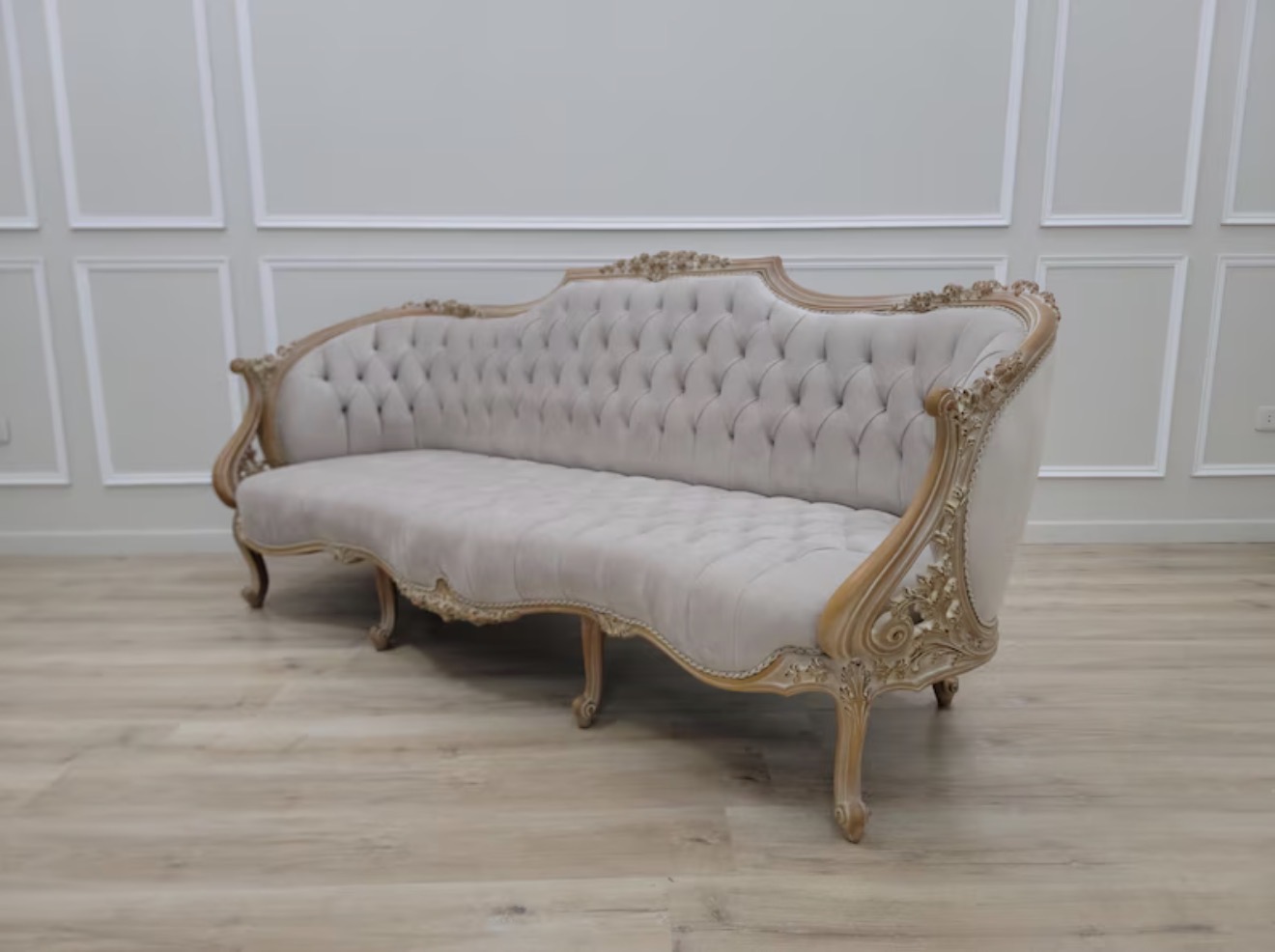 Transform your living space into a sophisticated oasis with this Elegant French-inspired Living Room Set. Crafted with a hand carved wood frame and luxurious light taupe velvet fabric, this set includes a stunning sofa, a pair of armchairs, and a cozy ottoman. Elevate your home decor with timeless elegance and comfort!