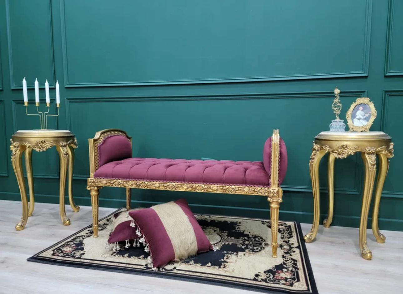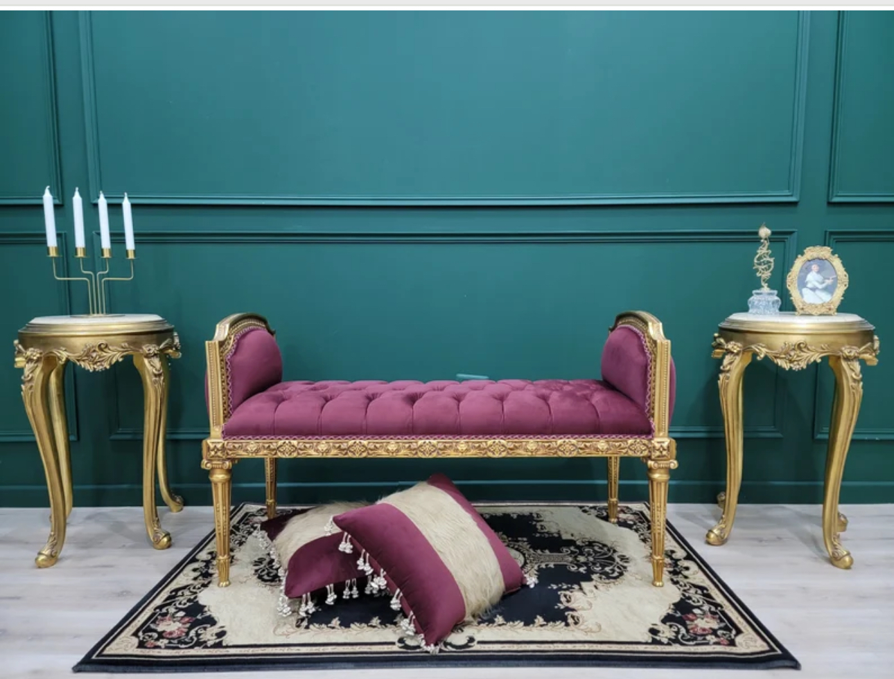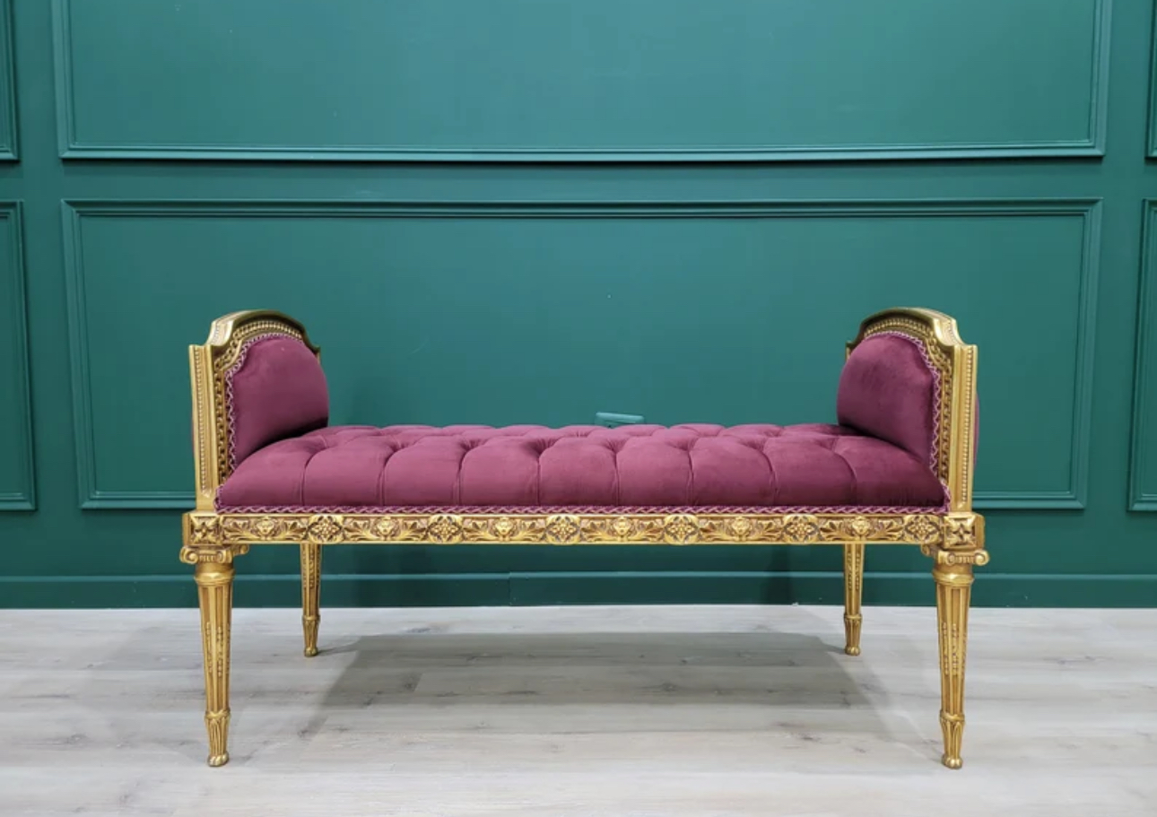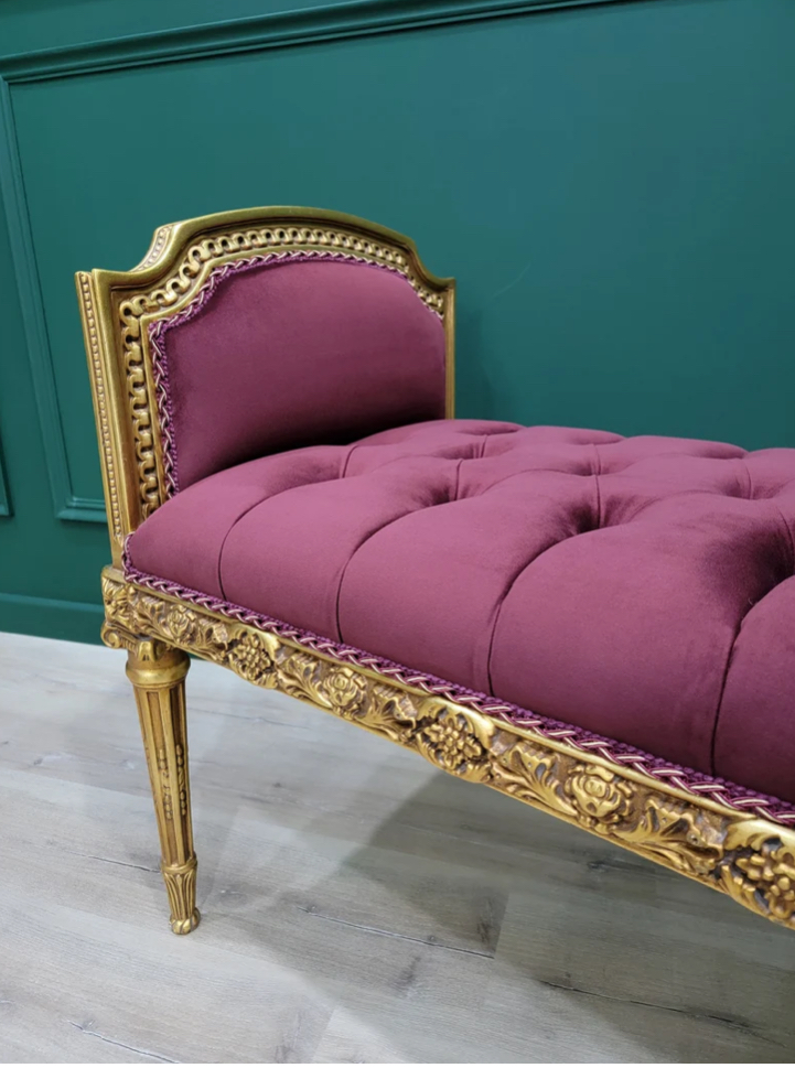 Transform your living space with this exquisite handcrafted wood bench featuring an elegant gold leaf finish and a luxurious tufted maroon velvet seat. Add a touch of sophistication and style to your home decor with this statement piece. Perfect for adding charm and comfort to any room.