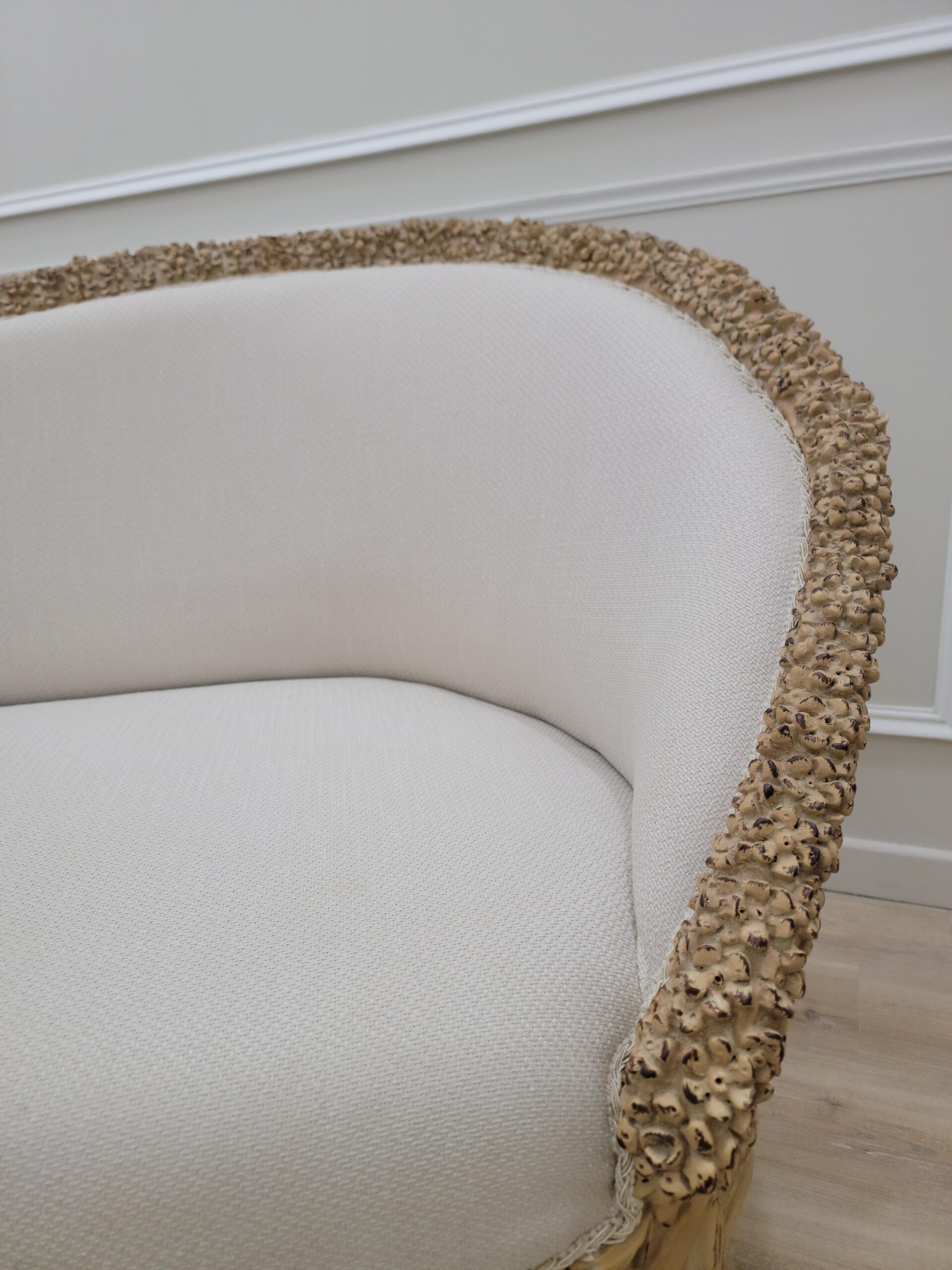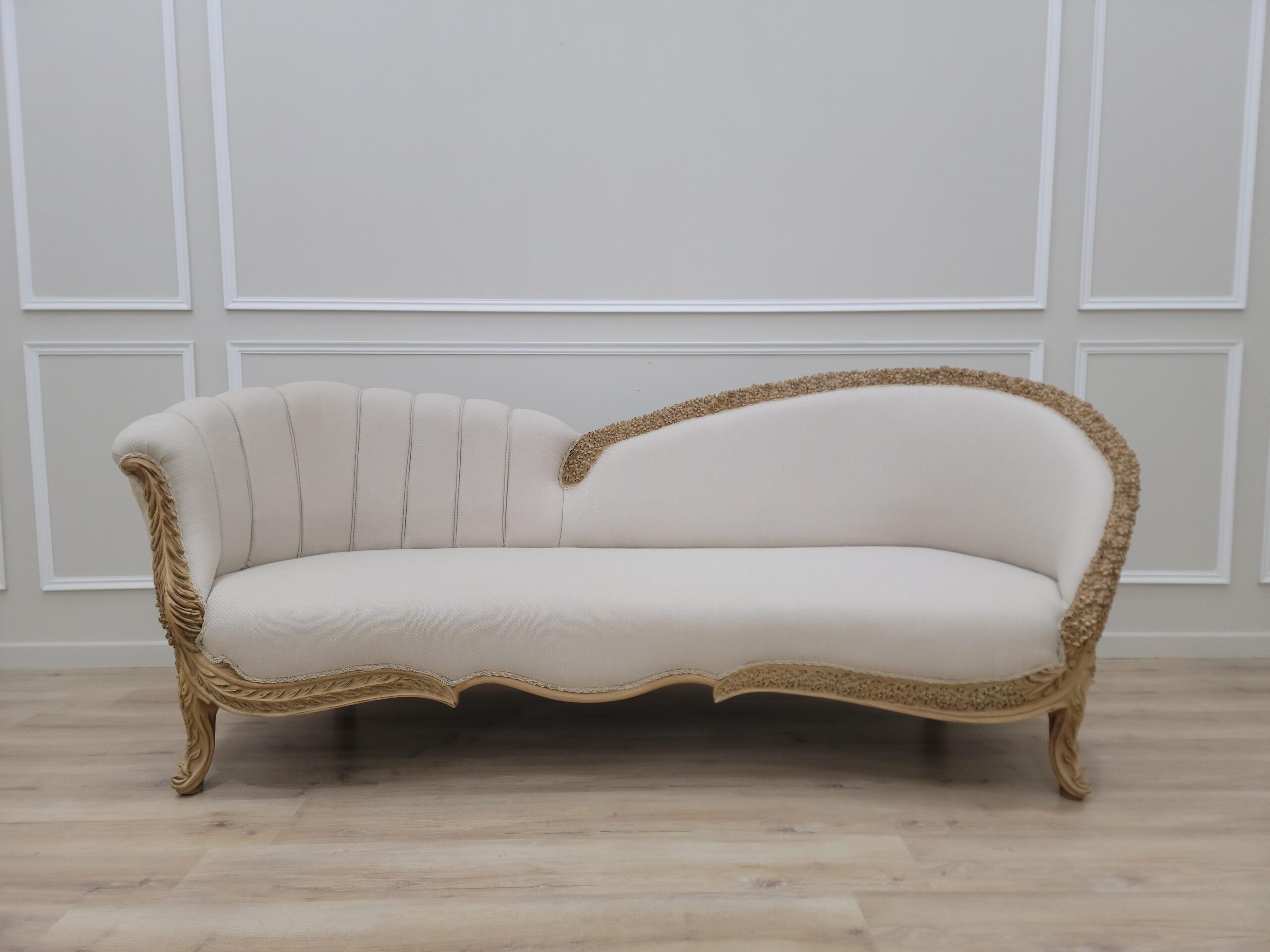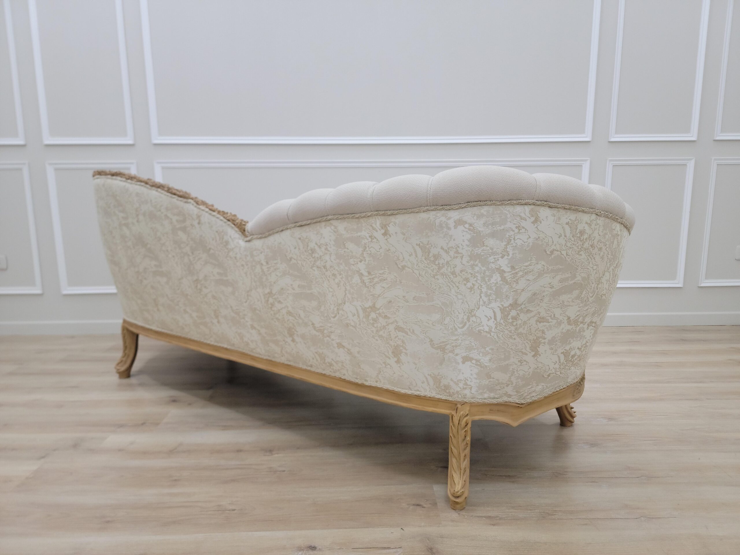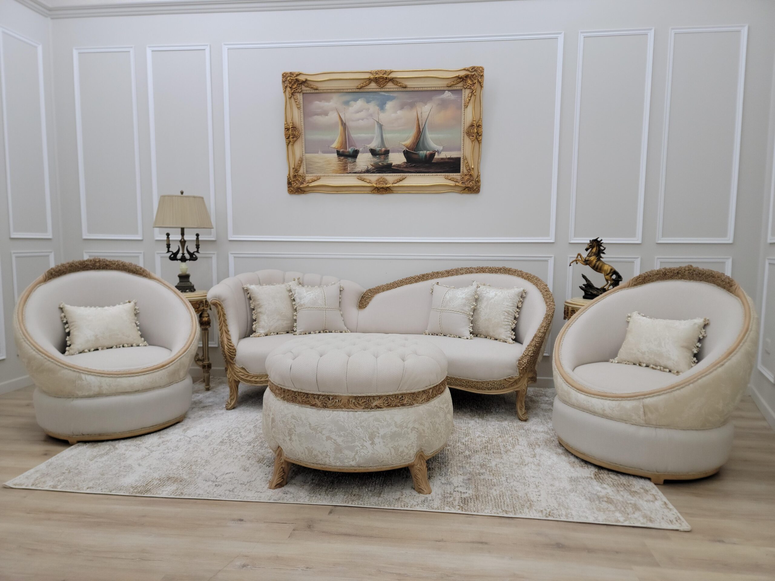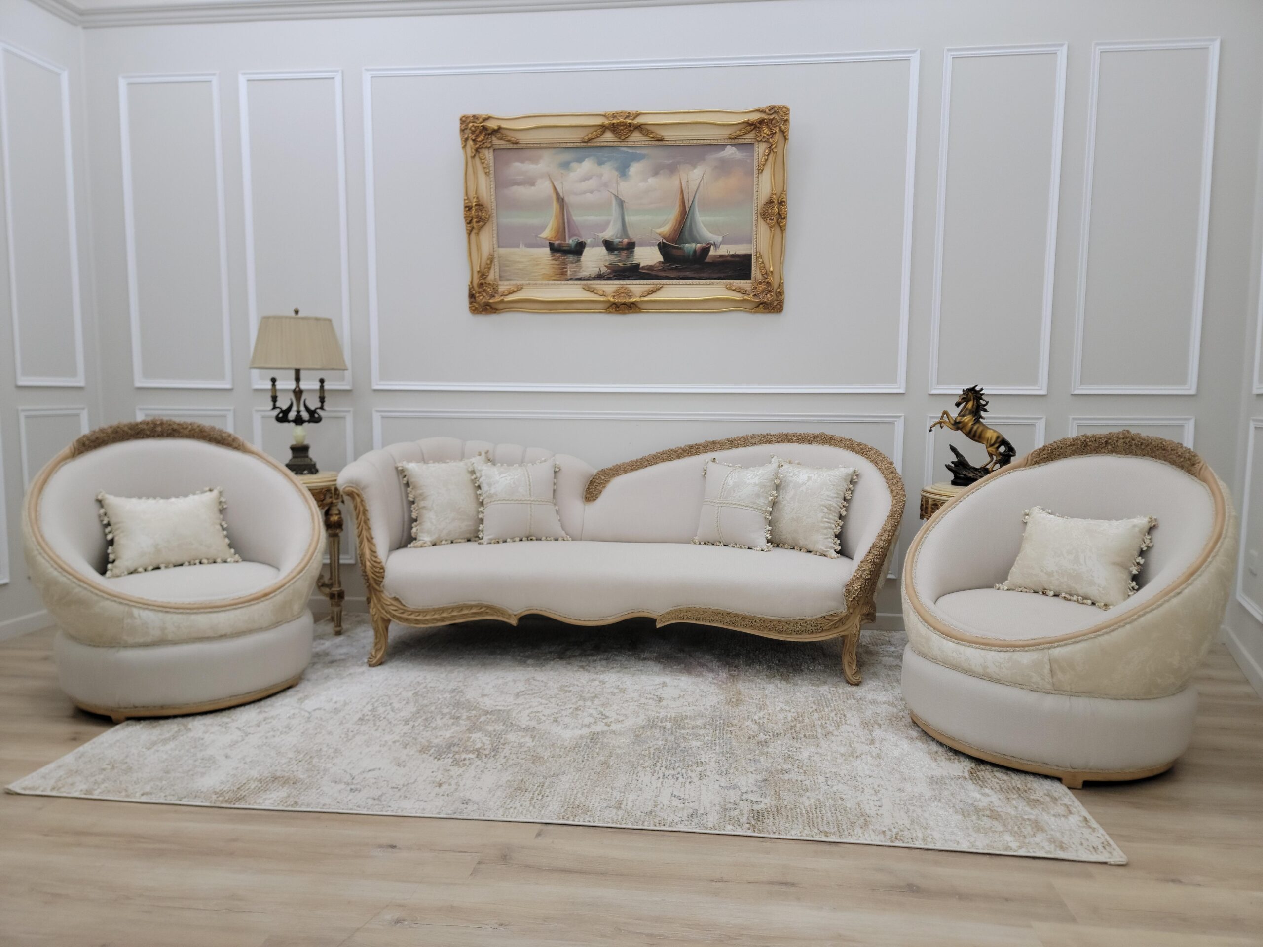 Neat lines sit adjacent to soft curves in this design. Hand-carved frames, intricately detailed backrests, extravagant Linen and damask fabric, Gold leaf – applied by hand and given an antique style finish – allows the beauty of each carved motif to shine.