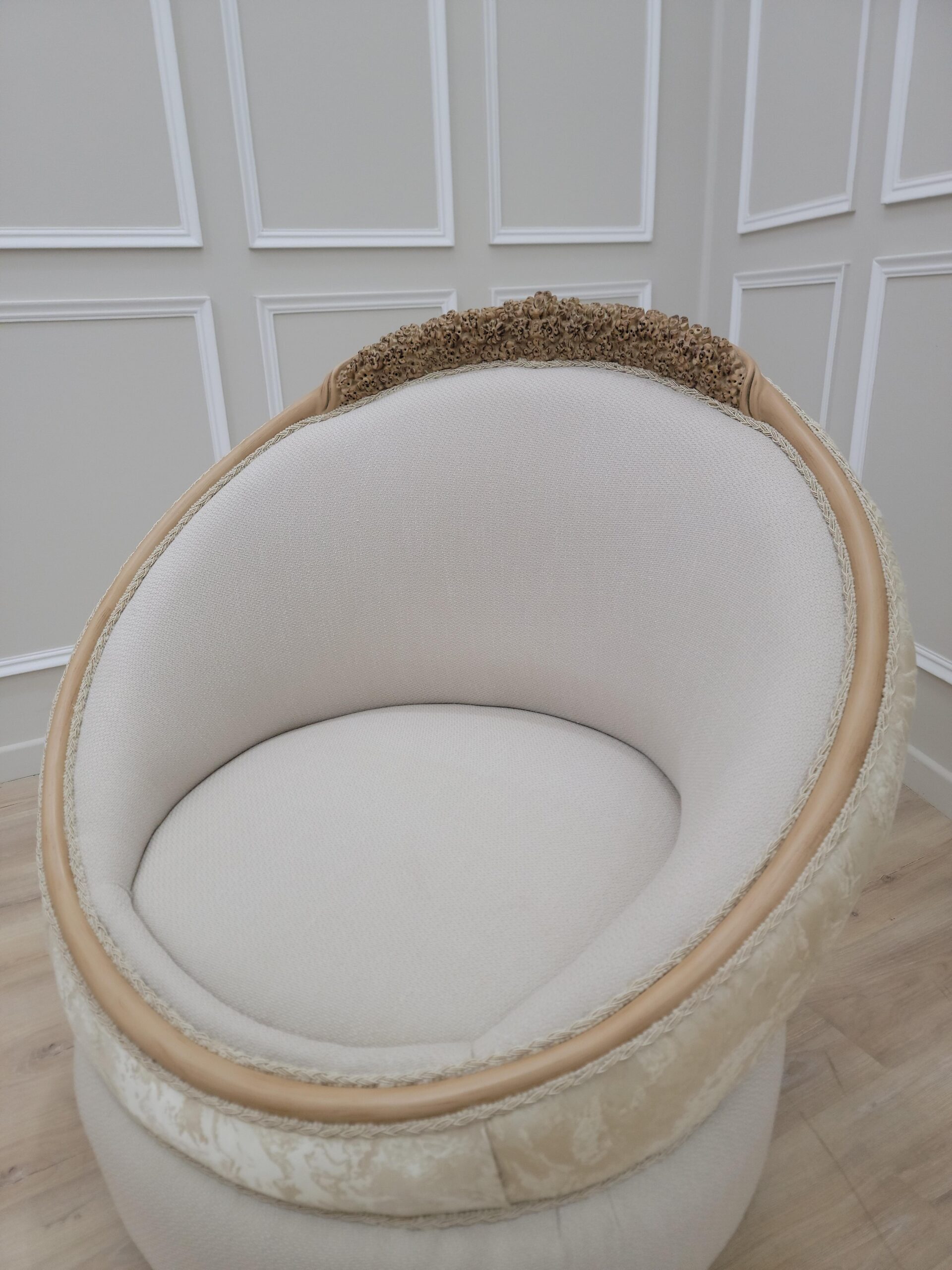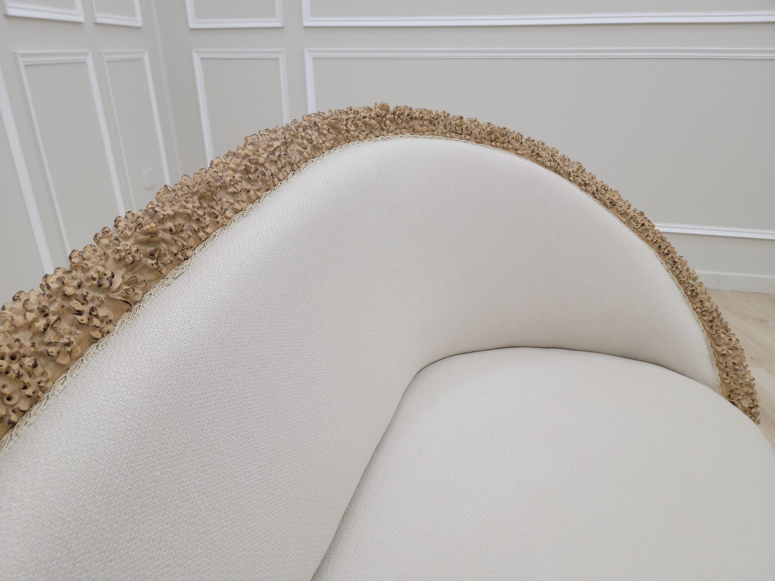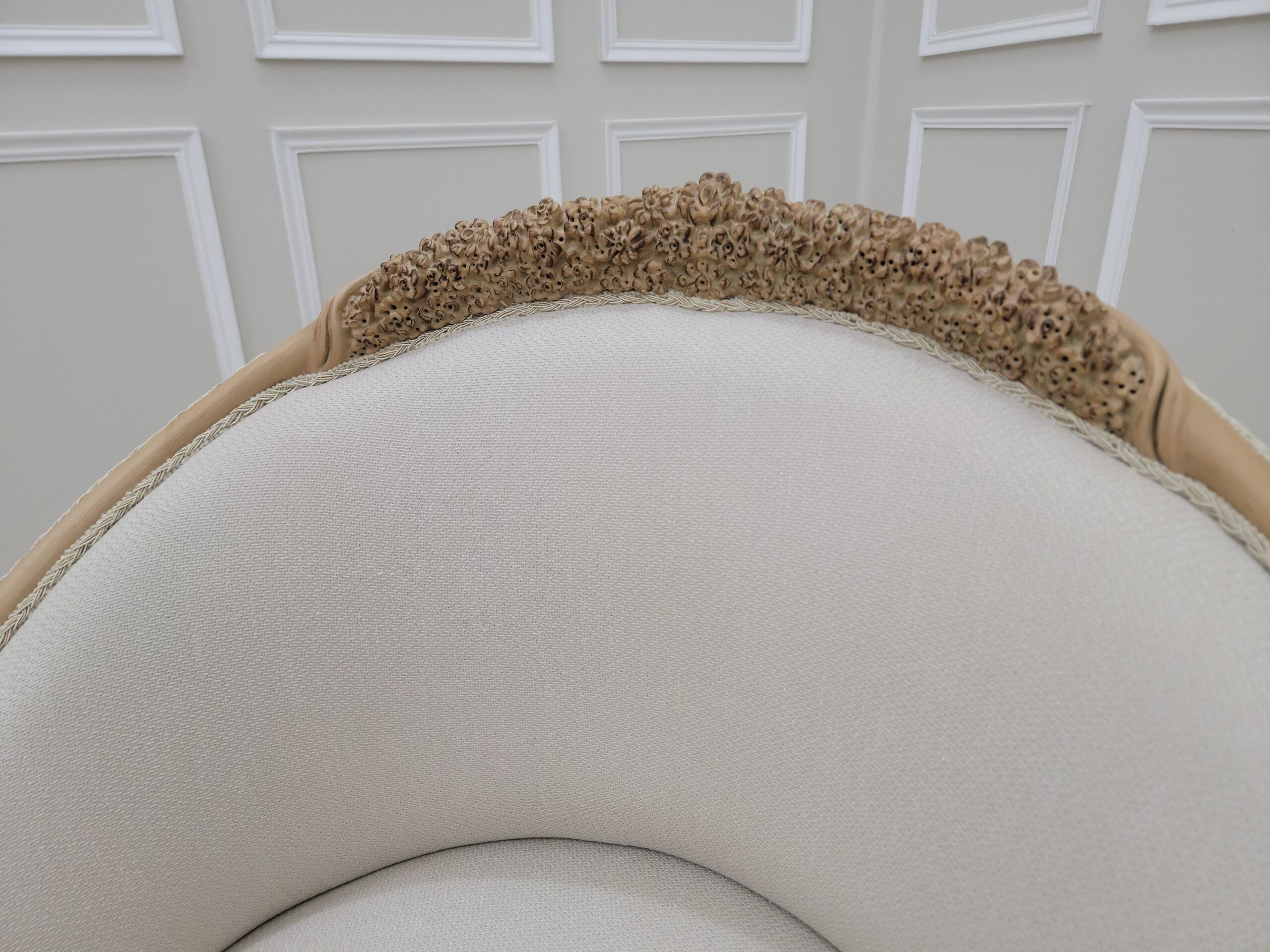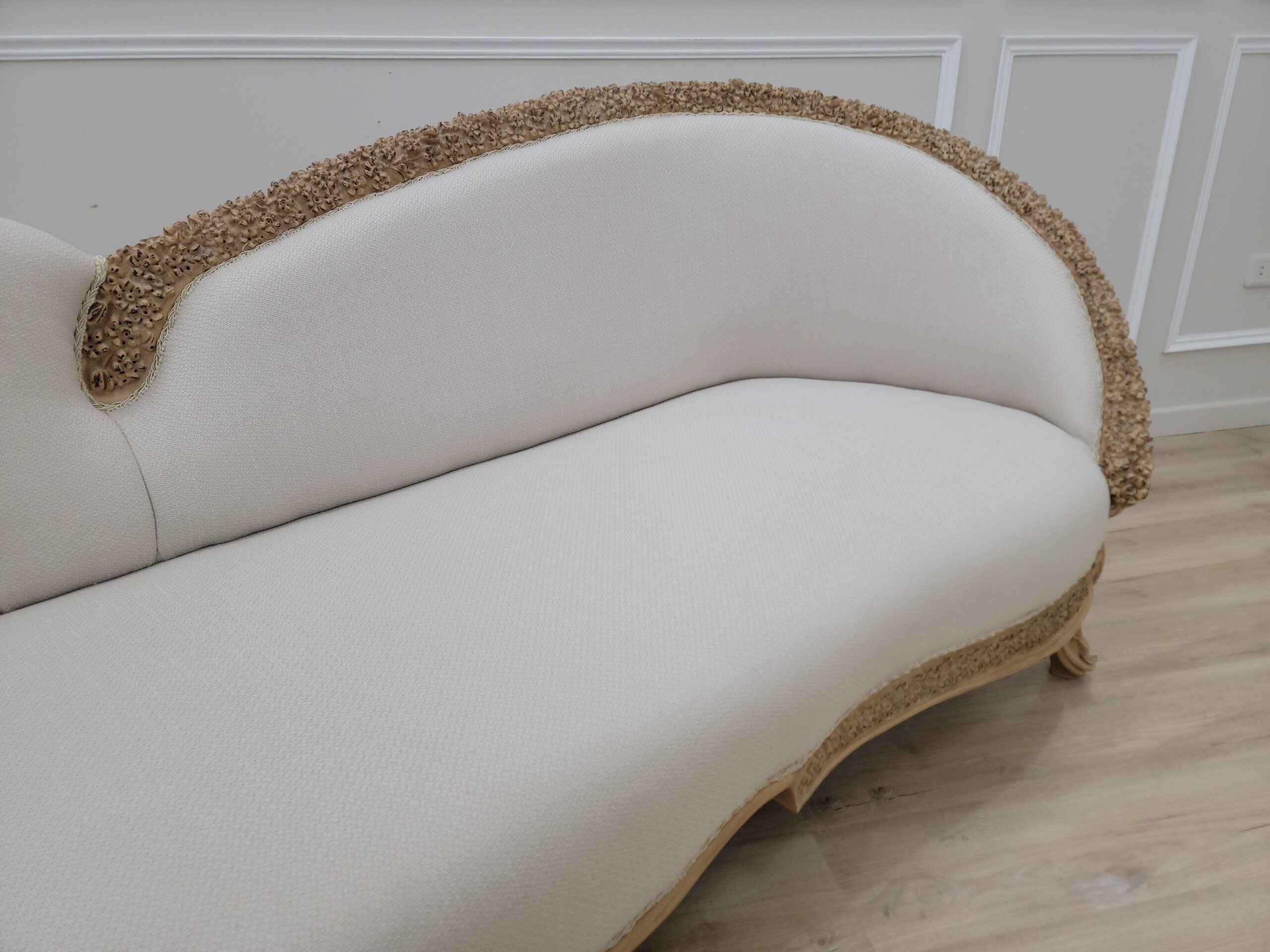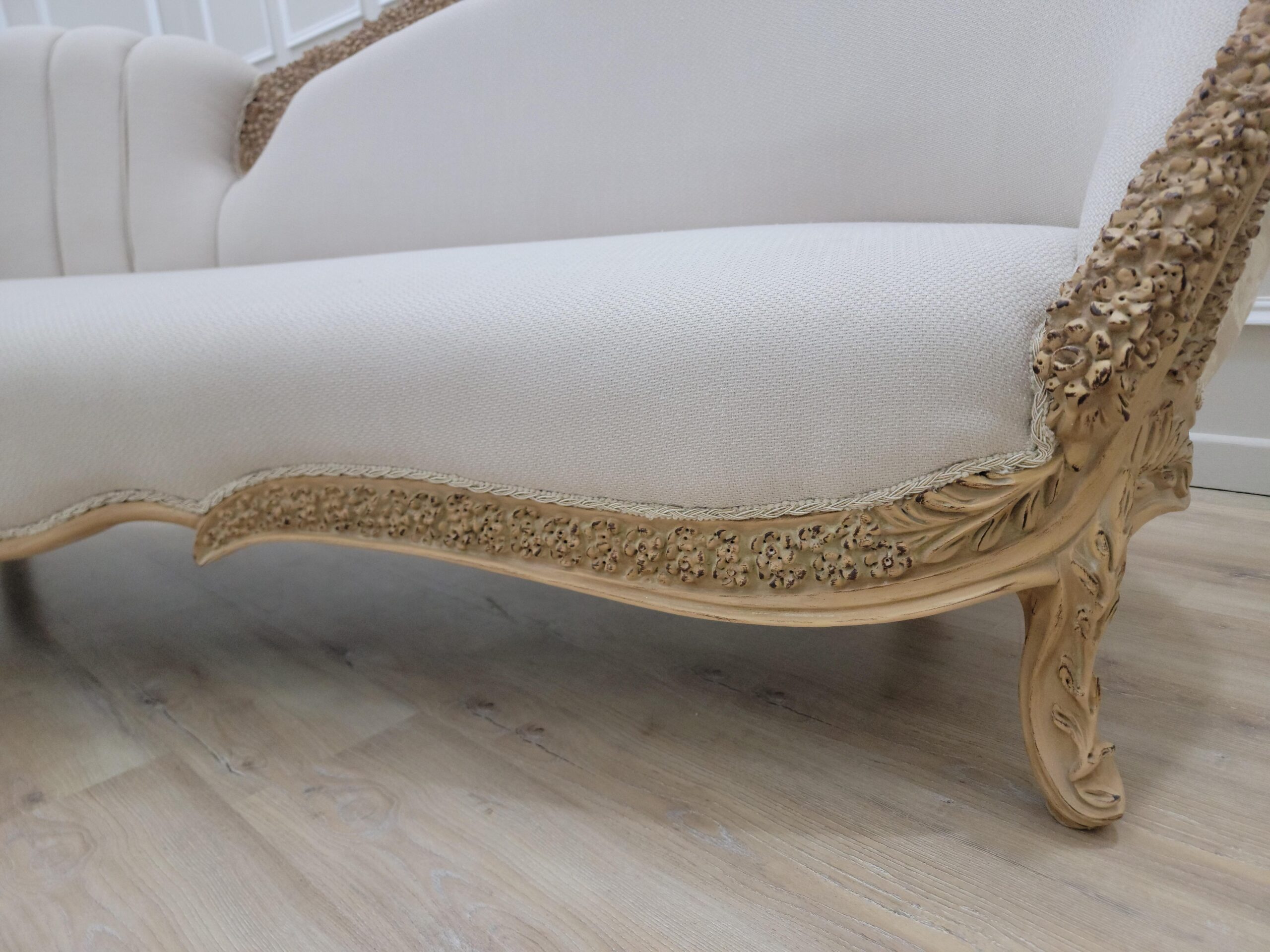 Neat lines sit adjacent to soft curves in this design. Hand-carved frames, intricately detailed backrests, extravagant Linen and damask fabric, Gold leaf – applied by hand and given an antique style finish – allows the beauty of each carved motif to shine.